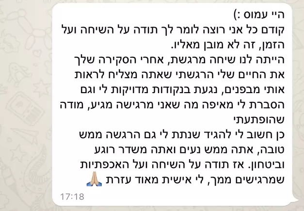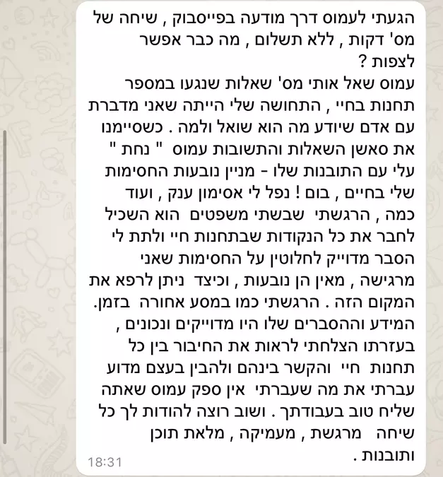 נעים מאוד, שמי עמוס, מרפא אנרגטי, מטפל בלא מודע ומתקשר. לפני למעלה מעשר שנים ייסדתי את משולש – ארגון המוביל אנשים לתהליכי ריפוי וצמיחה אישית, ואת "הילינג לייט" שיטת ריפוי אנרגטית. לאורך השנים טיפלתי באינספור אנשים עם בעיות שונות, החל מדפוסי חשיבה שליליים, הפרעות קשב, חרדות, דכאונות, סטרס, התמכרויות והרגלים לא בריאים, דרך בעיות תפקודיות שונות ועד למחלות אוטואימוניות ומחלות פיזיות אחרות.